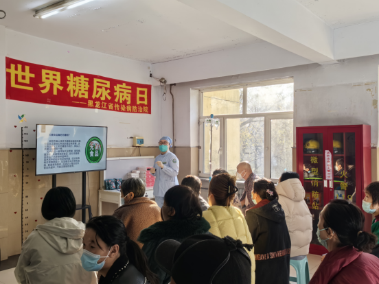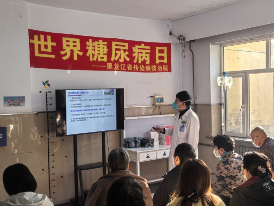 为了普及糖尿病的诊疗及护理常识,加强对糖尿病与结核病共病的认识,黑龙江省传染病防治院结核四病区的医生、内科护理二病区护士、内科护理四病区护士以及我院糖尿病专科小组于11月14日在住院处4号楼为患者及家属们进行了糖尿病、结核病早防早治的健康宣讲。首先由糖尿病专科护士鲁雪娇为患者科普了《糖尿病饮食治疗误区》,她用简单的言语为大家讲解了糖尿病的概念、特点以及相关的并发症,同时从自己丰富的护理经验中总结出了糖尿病患者的临床护理以及饮食护理、生活与运动常识,还为大家发放了糖尿病患者饮食食谱以及注意事项宣传单。