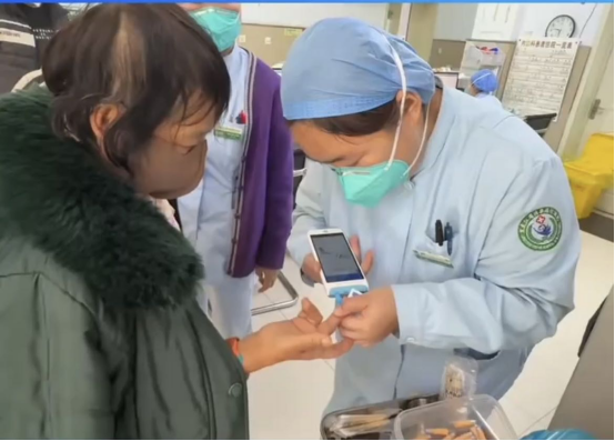 内科护理二病区张頔护士为病友们测量血糖,演示自测血糖的流程及注意事项。