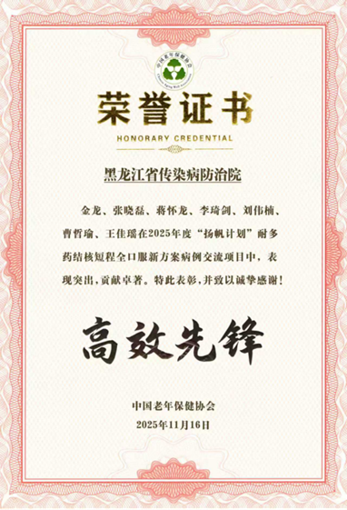 再次获得“高效先锋奖”,既是对我院在耐多药结核领域发展创新的高度肯定,也是对金龙主任团队的激励和鞭策。未来,金龙主任团队将继续勇担行业先锋使命,进一步深化与国内外顶尖机构的学术协作,强化科研创新与临床转化能力,持续提高耐多药结核病诊疗管理水平,以更广泛的行业协作、更前沿的科研成果、更优质的医疗服务,为实现“终结结核”的全球目标贡献龙江智慧与力量!