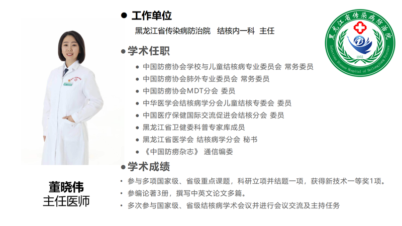 董晓伟,女,中共党员,主任医师,2003年参加工作至今,现任黑龙江省传染病防治院结核内一科主任。