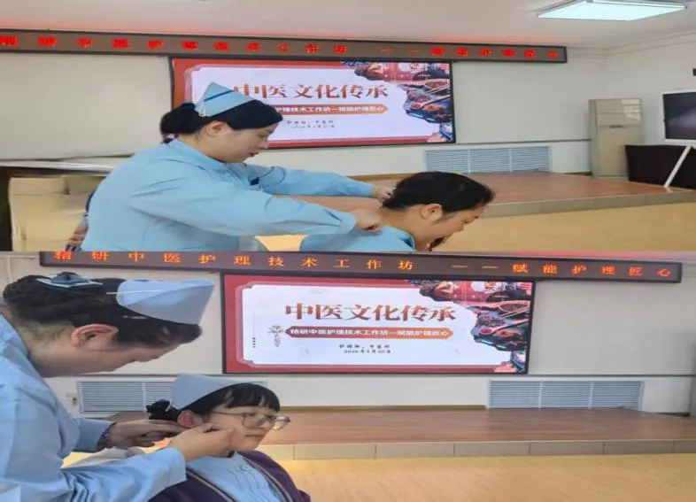 为深化理论学习成效,工作坊在授课后特设体验环节。护理骨干们在中医科老师的悉心指导下,亲手操练耳穴压豆、中药贴敷、铜砭刮痧等实用技术。从穴位定位的分毫精准,到手法力度的轻重拿捏,大家反复推敲打磨、领悟操作要点,在理论与实践的深度融合中夯实专业技能,现场洋溢着专注而热烈的学习气息。